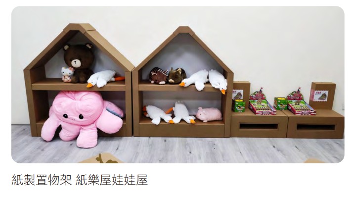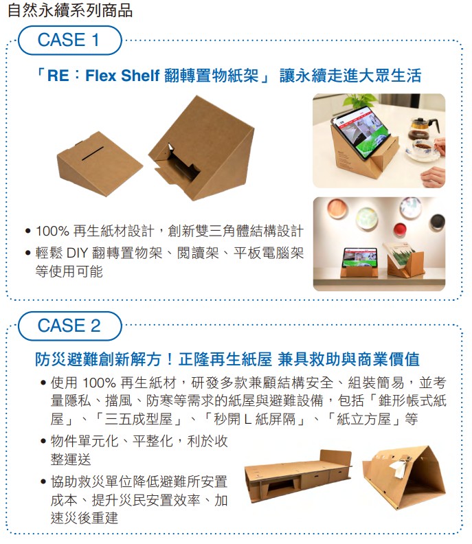 ✔ 新產品開發:(1)家庭用品類:持續開發高效吸水廚房紙巾、家庭用紙減塑包裝袋、泡麵杯套用紙、寵物防蟎、除臭用品、土肉桂環保防蟎洗衣精等。(2)工業包裝類:電商倉儲隔板及撿貨箱、環保抑草紙、低溫保鮮紙箱等。(3)生活紙品:RE翻轉置物架、紙屋紙床、紙樂屋品牌 - 娃娃屋及滾動牆教具等。