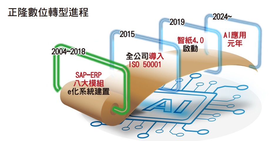 在全球經營環境劇變下,正隆以造紙產業指標企業之姿,積極推動數位智能轉型,提升營運競爭力。早自2004年,正隆即完成全集團ERP企業資源規劃,強化管理效率,並於2012至2017年間,自主開發后里廠汽電能源e化系統、全公司e化採購平台及家庭用紙CRM系統,深化數位應用。響應工業4.0政策,2019年,正隆啟動「智紙4.0」專案,積極推動智慧工廠轉型,透過設備整合、節能減碳監測與自動化管理,提升生產效率,減少人力依賴,成為台灣首家導入產銷智能化的造紙企業,加速邁向低碳營運。